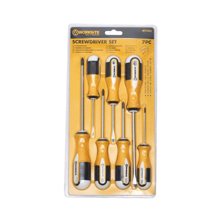 A WORKSITE WT1606 csavarhúzó készlet ideális választás barkácsoláshoz, szerelési és javítási feladatokhoz, hiszen tartalmaz minden alapvető szerszámot, amelyre a mindennapi munkavégzés során szükség lehet. A 7 darabos készlet tartalmaz lapos és Phillips csillag fejeket, így széleskörű felhasználást biztosít, legyen szó háztartási, műhely- vagy ipari feladatokról.